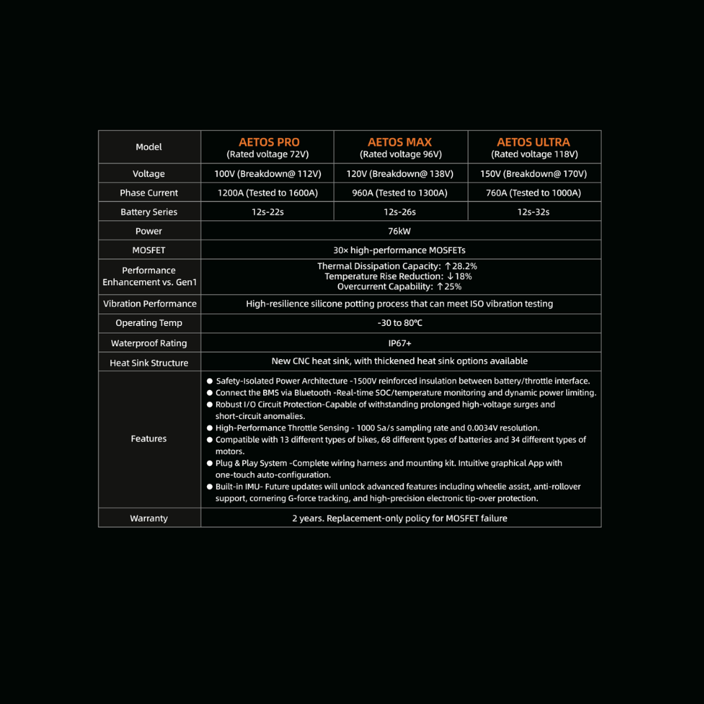 Built for riders who demand precision and power, the V9600 Gen.2 is one of the most advanced controllers available today. Capable of delivering up to 76 kW, it gives you full control over motor behavior through a detailed, intuitive mobile app. Whether you're unlocking maximum output or fine-tuning throttle response down to the smallest detail, the V9600 Gen.2 stays smooth, progressive, and perfectly manageable—while still delivering explosive acceleration when you want it.